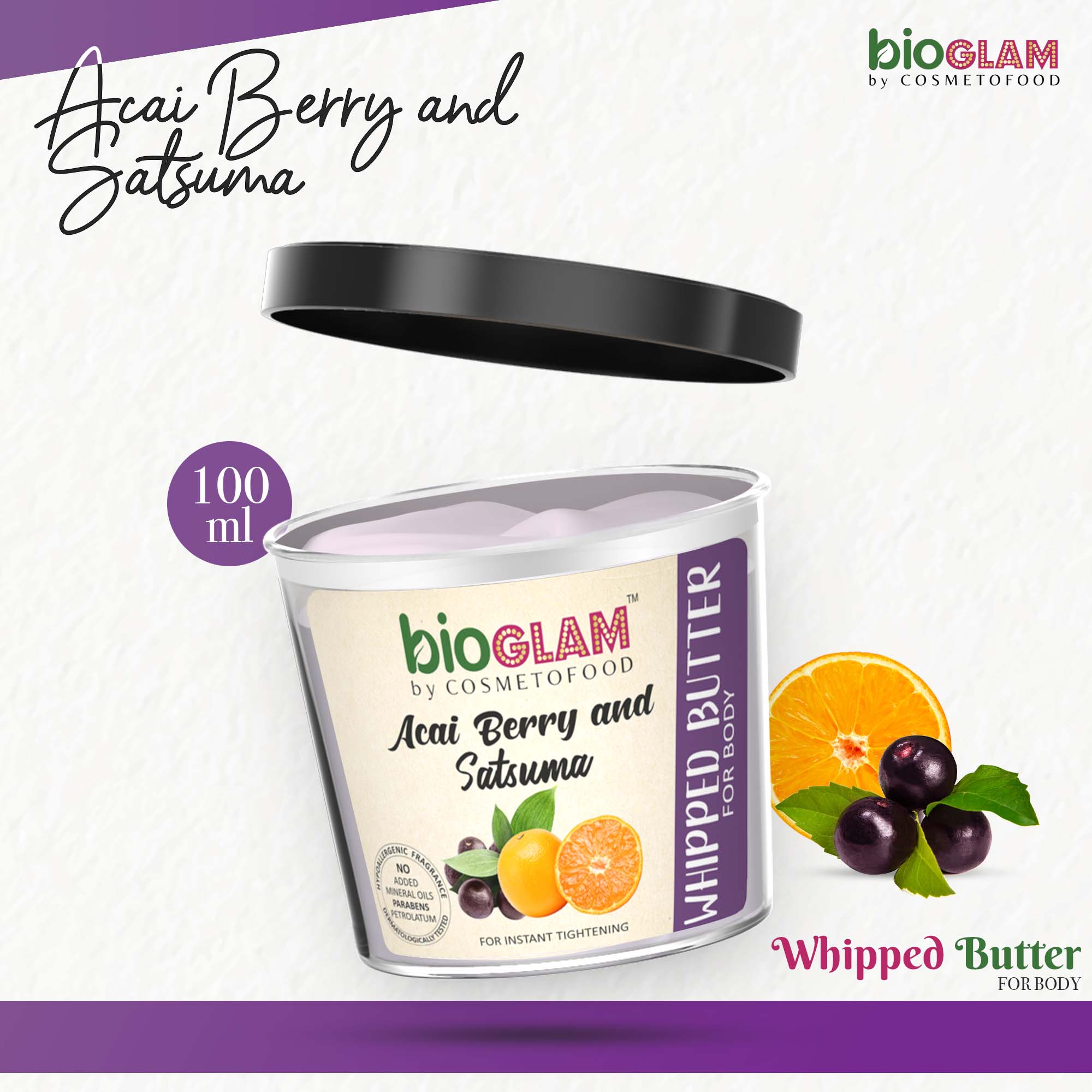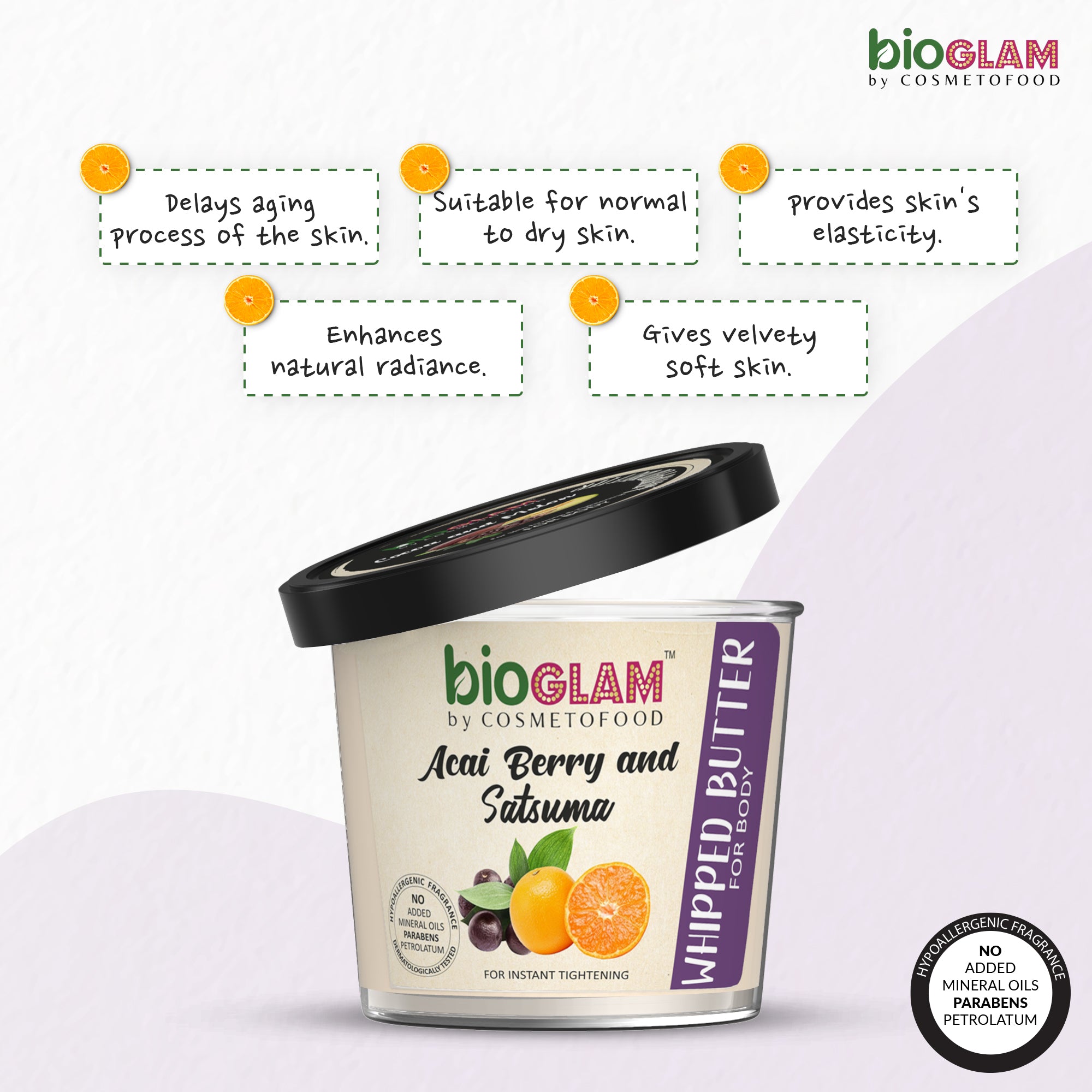 “The fresh and energizing whipped body butter has a non-oily and non- greasy approach to moisturise your body as it slowly melts into your skin. The lustrous texture of satsuma strengthens the skin immune system and keeps the skin smooth and elastic.
