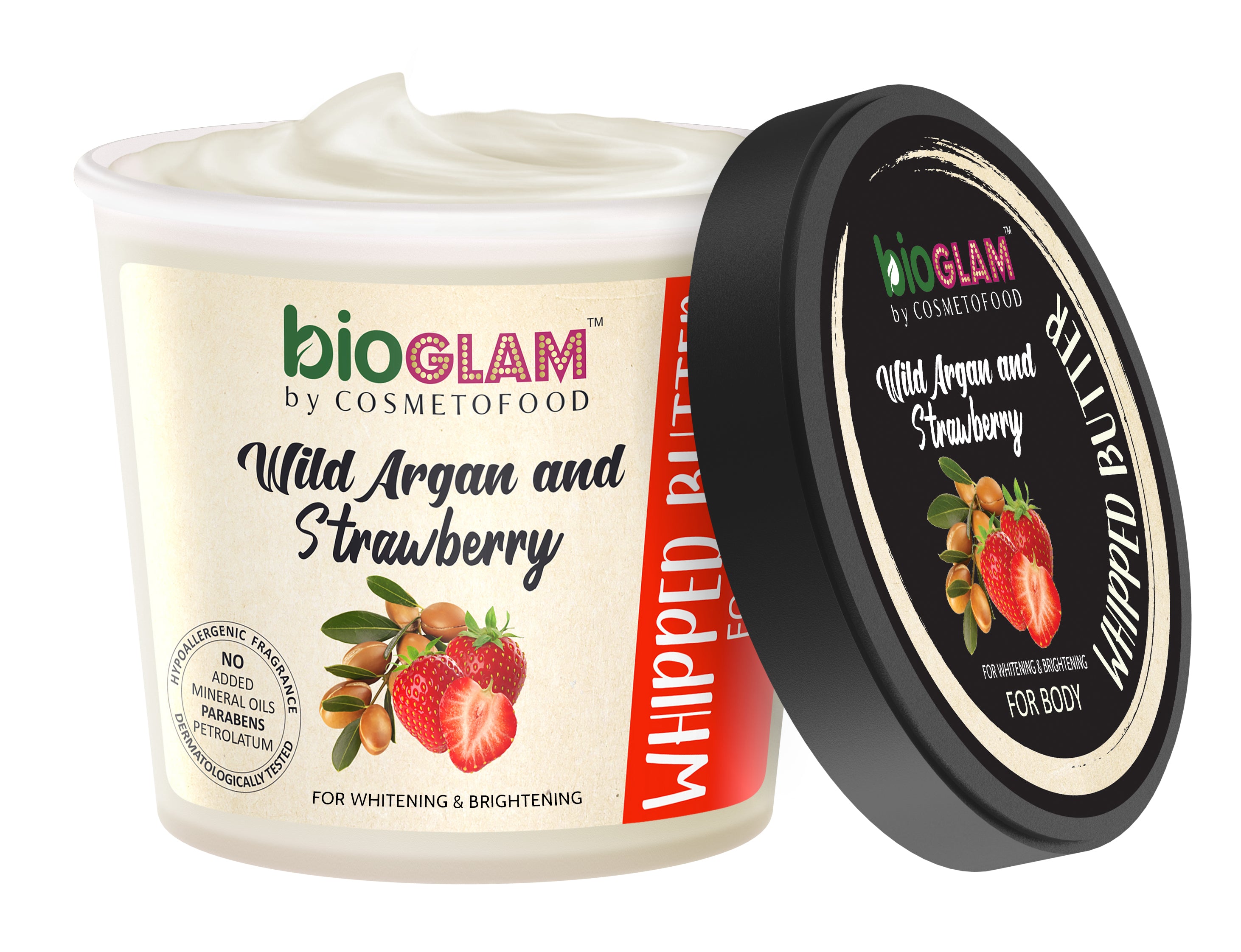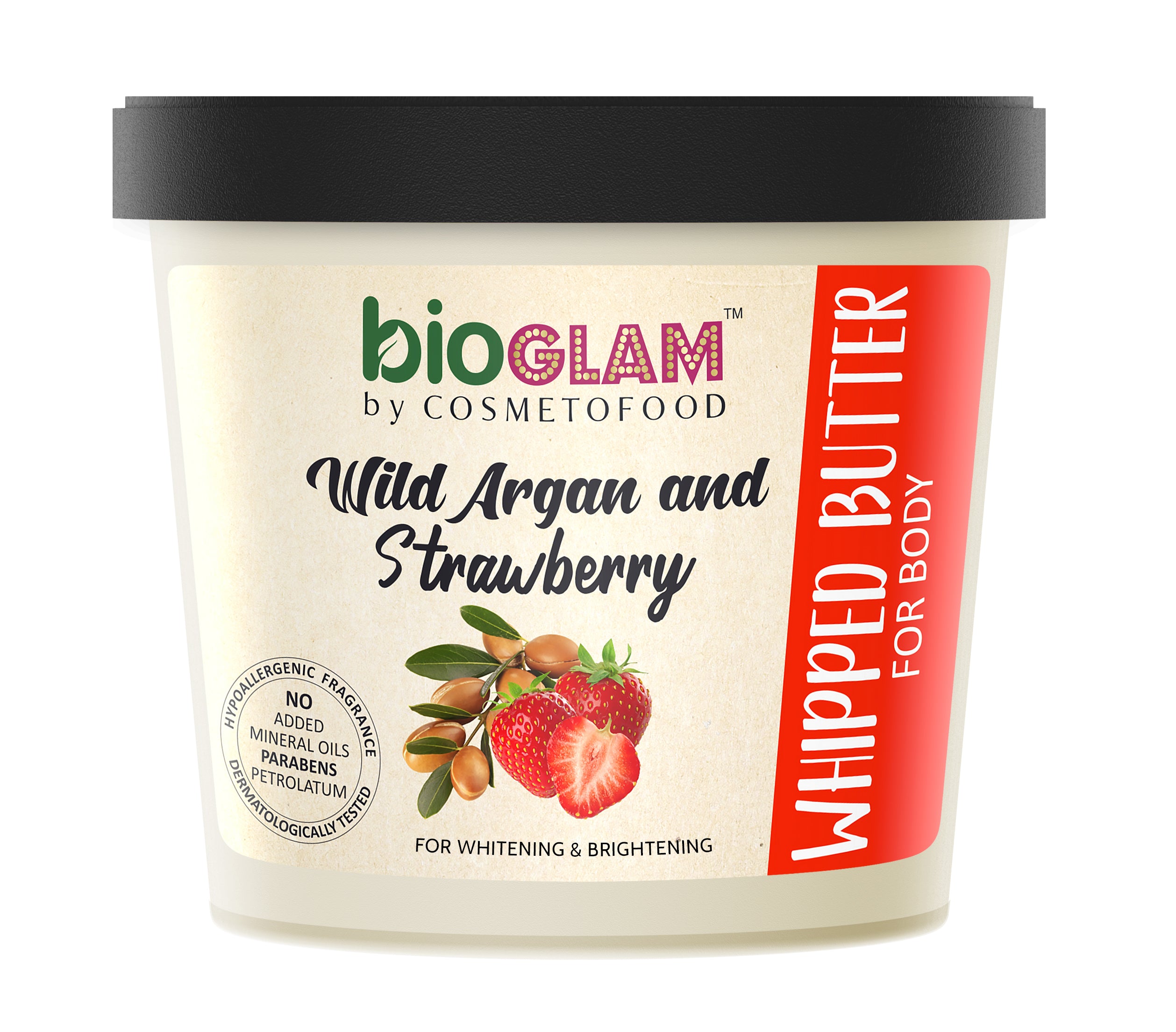 The non-oily, omega-3 and omega-9 rich body butter with a beautifully creamy and luxurious feel protects the skin from UV rays and sun damage, the strawberry enriches it with a high content of Vitamin-c which efficiently lightens the skin, controls the blemishes and reduce the acne scars.